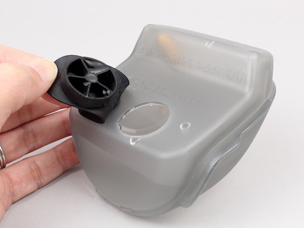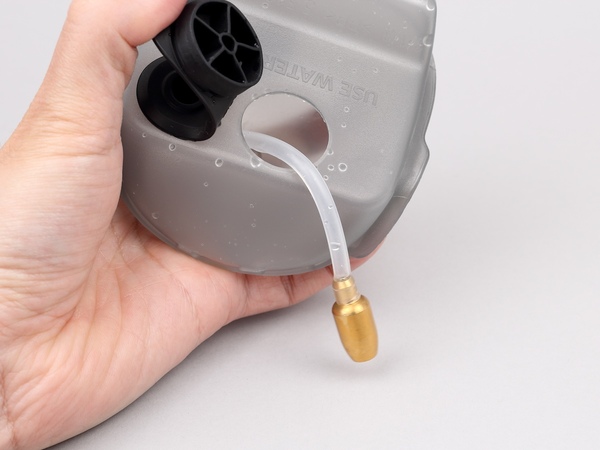 ちなみに、この給水タンクの中にはオモリのついたチューブが入っています。これは、チューブの向きが悪く水を吸い上げられない……というのを防ぐためのもの。中に入れたまま使います。