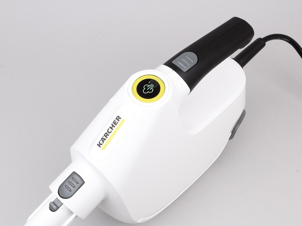 プラグをコンセントに差し込むと、スチームボタンが黄色に点滅。加熱が始まります。といってもほんの30秒ほどで終わり、緑色に点灯すれば準備完了。この状態でスチームボタンを押すと蒸気が噴出し、もう一度押すと、止まります。分かりやすいですね。