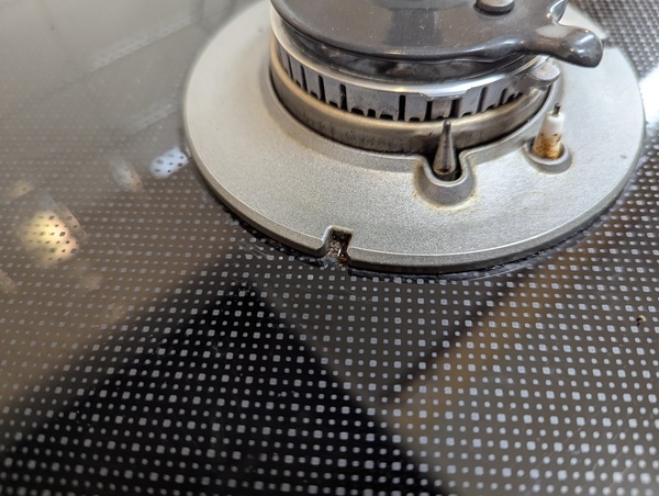 先端のブラシがそこそこ固いので、頑固な汚れを落とすのに向いています。実は引っ越したばかりで汚れているところがあまりないのですが、ガステーブルのコンロ隅に溜まった汚れで試してみました。