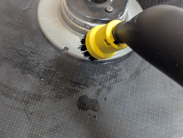 やったことといえば、汚れのひどい細部に蒸気を数秒当て、ブラシの先でゴシゴシと往復させただけ。開始から終了まで、30秒もかけていません。ももちろん、洗剤もナシです。