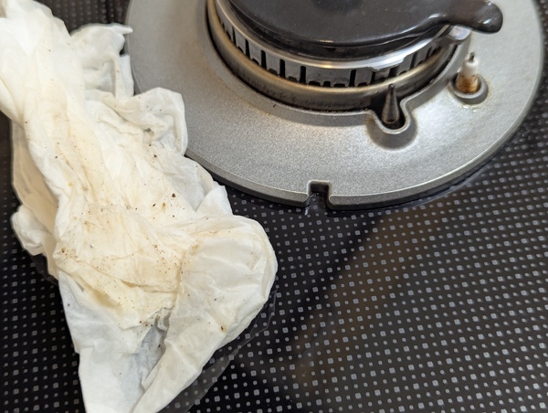 蒸気ですから、どうしても清掃後はびちゃびちゃになります。これをキッチンペーパーで拭いてみたところ……あらビックリ。ちゃんと汚れが落ちているようで、みるみる茶色になっていきました。