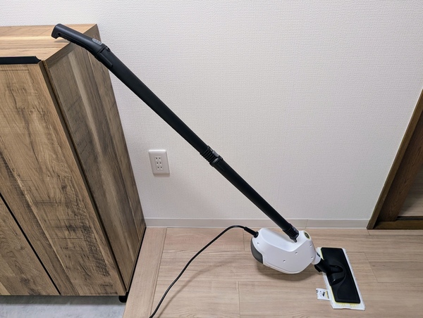 面白いのは2本の延長パイプが付属し、柔軟に組み替えられること。蒸気は噴出孔から離れるほど温度が下がるため、本体の先に延長パイプを付けてしまうと、先端での温度はかなり下がってしまいます。なるべく温度を保ちたいなら、本体に直接フロアノズルを装着し、グリップ側をパイプで延長するというのがオススメです。