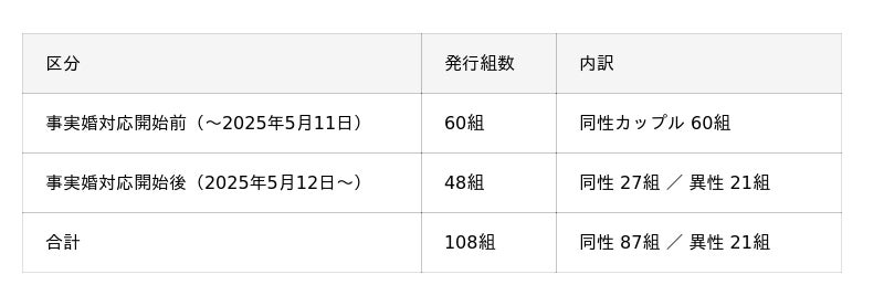 事実婚対応開始後の年間新規発行数の推移を見ると、2025年は+45組と、前年2024年の+23組から約2倍に急増しました。また直近では月間5~9組のペースが続いており、2026年に入っても加速傾向が継続しています。