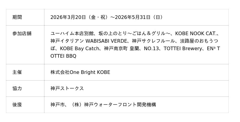 株式会社One Bright KOBE(住所:神戸市中央区、代表取締役社長 渋谷 順)は、TOTTEI開業1周年と、3月20日(金・祝)からの「TOTTEI KOBE 開港祭 Supported by 神戸トヨペット」開催を記念して、TOTTEI内のレストラン&カフェ店舗と神戸ストークスがコラボするTOTTEIアプリスタンプラリーを実施します。