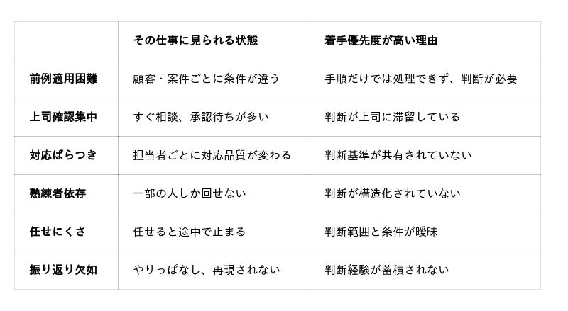今回当社では、判断構造設計を最初に入れるべき仕事には、いくつかの共通条件があると整理しました。たとえば、- 顧客や案件ごとに条件が異なり前例がそのまま使えない仕事