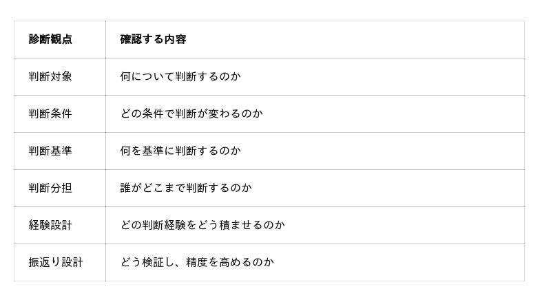 これらに明確に答えられない仕事ほど、判断構造が未設計であり、判断できる人材が育ちにくい仕事であると考えられます。