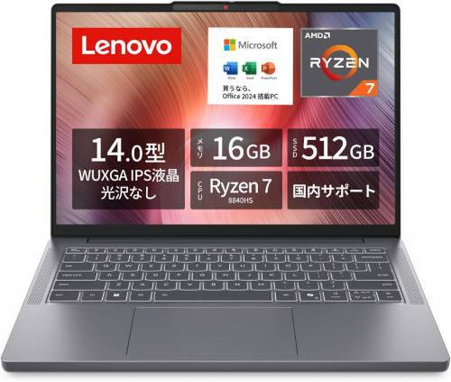 Ryzen 7 8840HSと16GBメモリを備えたモデルで、資料を作りながらブラウザで調べものを進めるような普段の使い方でも作業を続けやすい。512GB SSDを搭載し、写真や書類などの保存にも対応できる容量を確保している。