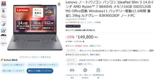 【Amazonで15%オフ】Lenovo 14型ノート「IdeaPad Slim 3(83K90028JP)」をチェック!