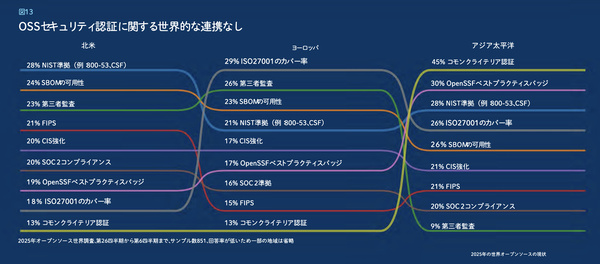 OSSの信頼性を担保するために企業が期待するセキュリティ認証(地域ごとの順位)。大きな“分断”がある点が課題(出典:Linux Foundation)