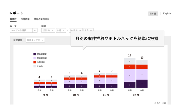 「LegalOn」、案件数や処理時間など法務組織の稼働状況を可視化する「CLMレポート」提供開始