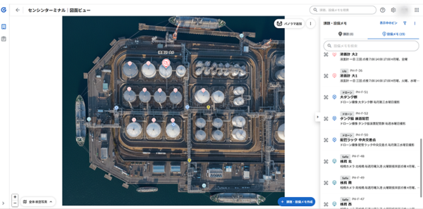「ゲンコネ+IoT」では航空写真や地図、CAD図面、P&ID図、現場パノラマ画像など、複数のベース上にデバイスを登録可能。設置場所を記憶に頼らず把握できる。また、異なる図面間での「同一IoTデバイス」のひもづけも可能。「現場写真のこのカメラ」=「CAD図面上のこの位置」=「P&ID上のこの設備」といった対応関係を明確にできるという。