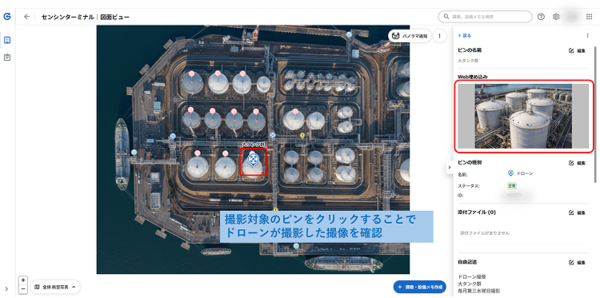 ドローンが取得したデータとの連携も可能で、データ管理機能を持つ同社独自のアプリケーション「SENSYN CORE Datastore」との連携で、ドローンが撮影した画像を「ゲンコネ」上のピンから直接確認できるという。