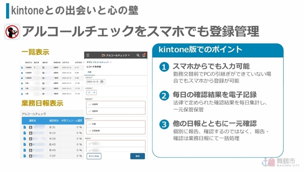消防本部の現場は当初、kintoneの活用に「なんでそんなことせなあかんのや」「電子決済やペーパーレスもやらんなんのに」と冷ややかだったという。それでも、所長によるトップダウンでアプリ開発はスタート。その結果、最初に生まれたのが「アルコールチェックアプリ」である。