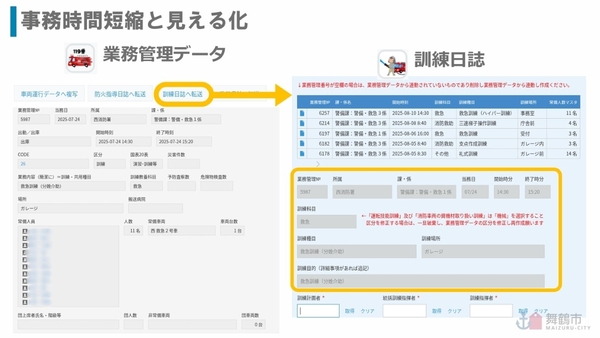 例えば、訓練後に日誌を作成する場合は、同アプリに主要項目を入力後にボタンを押すだけで、必要な情報が訓練日誌アプリに転送される。