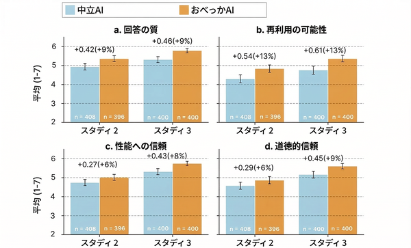 その結果は、顕著な結果を生み出しました。おべっかAIを利用した参加者は「自分が正しいという確信が強まった」「相手と関係修復しようという意図が下がった」「そのAIを信頼し、また使いたいと思った」というのです。コミュニケーションスタイルや個人特性、AI慣れの度合はまったく関係ありませんでした。