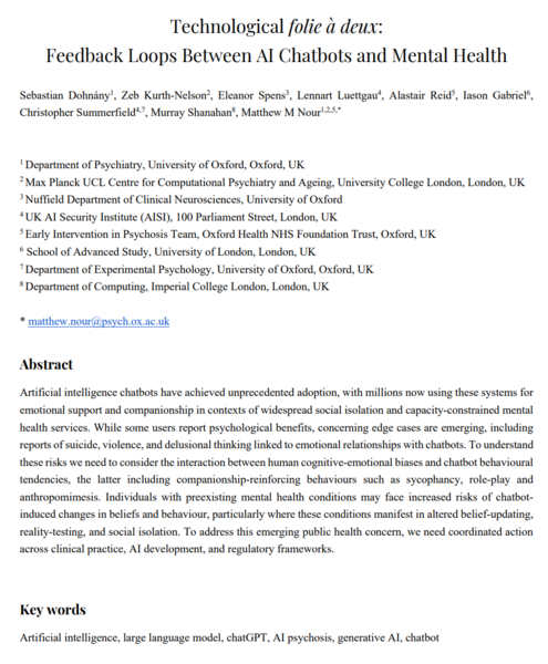 2025年7月(2026年3月に最新版に改稿)に、オックスフォード大学精神医学科の研究チームは「技術的『二人狂い』:AIチャットボットとメンタルヘルスの間のフィードバックループ」というAIのもたらすリスクを検討した論文を発表しました。DeepMindに所属する研究者も含まれています。世界的な科学誌Nature系列のジャーナルに掲載されました。