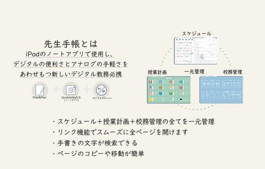 ~ 先生に寄り添うデジタル手帳 ~ iPadのノートアプリで使える教員専用デジタル手帳。現役の先生の声に応えて【 予定管理+授業計画+校務管理 】を一つにまとめ業務効率化をサポート。