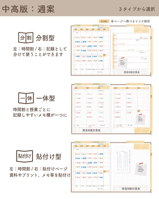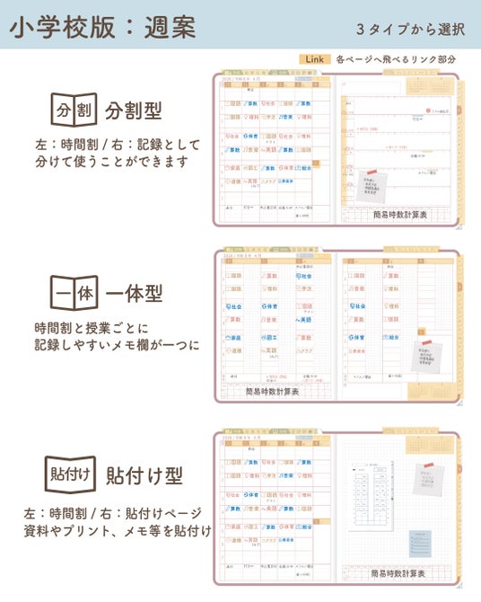 ・週案:1週間見開きタイプ/週案+記録の分割タイプ/週案+貼付けスペースの貼付けタイプ