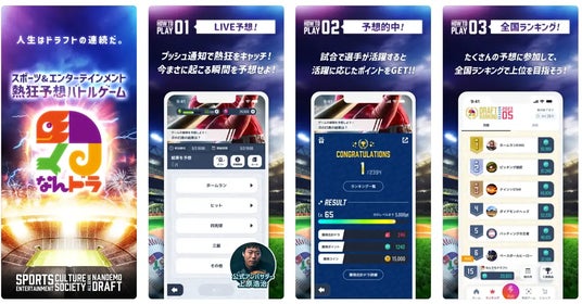 「なんドラ」はアプリケーションを利用し試合の勝敗や特定選手の活躍などを予想するサービスです。 月間・週間で公開されるランキングで全国にいる利用者と順位を競い、スポーツ観戦に新たな観戦価値と熱狂を提供します。また各予想の順位に応じて、必ず獲得できるポイントを貯めて、カタログギフトの中からお好きなギフトと交換できるほか、協賛社提供のギフトが順位に応じてさらにプレゼントされる予想もあります。