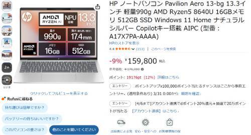 HPの13.3インチノートPC「Pavilion Aero 13-bg(A17X7PA-AAAA)」が、Amazonで割引対象。 参考価格176,000円のところ、9%オフの159,800円で販売中。