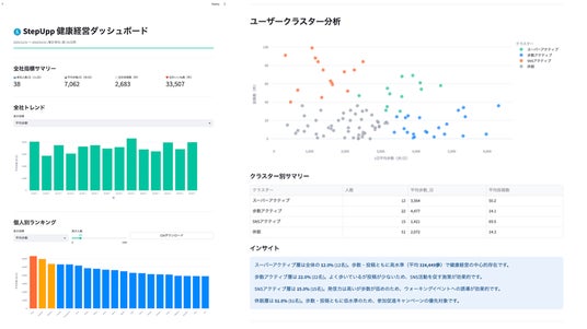 企業/団体の管理者側のダッシュボードには日/週/月/年単位で、最新の全社指標サマリーと、各種データ(平均歩数、SNS投稿数等)の時系列でのトレンド、そして個人別のランキングが見れる仕様となっております。またユーザークラスター分析により、参加者別に4つのグループ(スーパーアクティブ、歩数アクティブ、SNSアクティブ、休戦中)に分け、分析結果を提供しております。