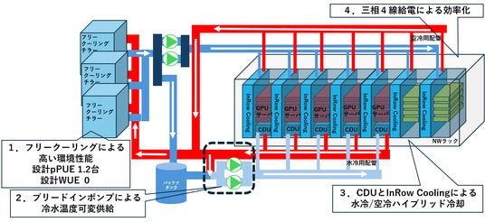 - 水冷/空冷ハイブリッド冷却水冷:空冷=7:3をベースとし、サーバのGPU/ CPUは水冷で、それ以外の部分を空冷で冷却