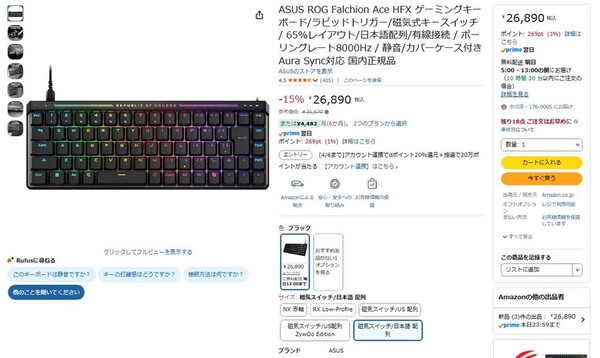 Amazon.co.jpにて、ASUSのゲーミングキーボード「ROG Falchion Ace HFX(磁気スイッチ/日本語配列)」が販売中だ。参考価格は3万1570円だが、執筆時点では15%オフの2万6890円で購入できる(3月23日時点)。