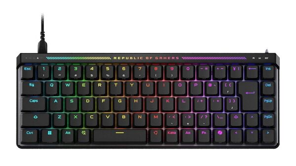 本製品は65%レイアウトのテンキーレスキーボードで、作動点を0.1~4.0mmにカスタマイズできるラピッドトリガーを搭載している。ラピッドトリガー機能を手動で切り替えられるトグルや、しっかりとした打鍵感が味わえるというROG HFX磁気式キースイッチ、8000Hzのポーリングレートなどが特徴だ。
