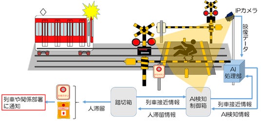 本システムは、踏切道や構内踏切(以下、「踏切道等」)に設置したカメラの映像をAIが画像解析し、列車接近時、踏切道等に取り残された人や障害物を検知した場合、押ボタン式踏切支障報知装置または非常通報装置を動作させることで、いち早く列車や関係部署へ通知します。