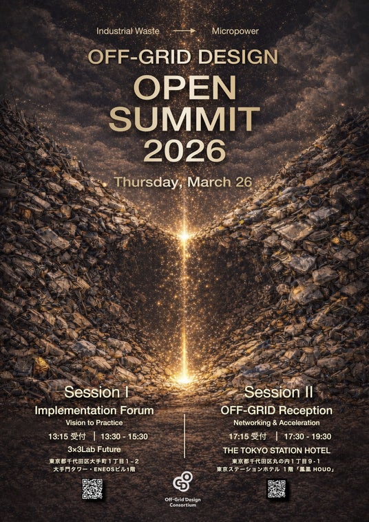 一般社団法人オフグリッド・デザインコンソーシアム(所在地:東京都千代田区、代表理事:中川聰、以下OGD)は、2026年3月26日(木)、東京にて「OFF-GRID DESIGN OPEN SUMMIT 2026」を開催いたします。本サミットでは、暮らしの中の食品残渣から社会的問題となっている産業廃棄物まで、様々な素材を活用して微小な電力を取り出す独自技術「超小集電(Micropower Collection : MPC)」を軸に地域の分散型自立を支援し、オフグリッド社会の実現に向けたビジョンやテクノロジーを発表します。従来のインフラのあり方を問い直し、"Industrial Waste → Micropower"という新たな再生循環型の価値転換を社会に提案する場となります。