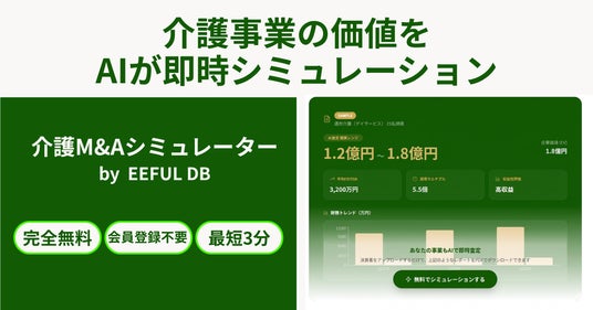 介護情報ポータルサイト「EEFUL DB」を運営するEEFULホールディングス株式会社(本社:東京都、代表取締役:森山穂貴)は、介護事業経営者向けのAI査定サービス「介護M&Aシミュレーター by EEFUL DB」を2026年3月23日(月)より無料公開しました。