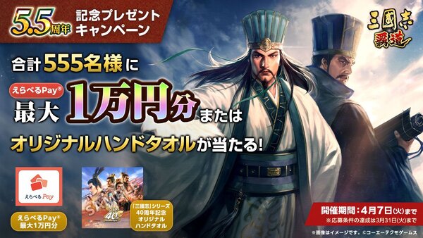 賞品詳細:合計555名に「えらべるPay」または「三國志」シリーズ40周年記念オリジナルハンドタオルが当たる。内訳は以下のとおり。