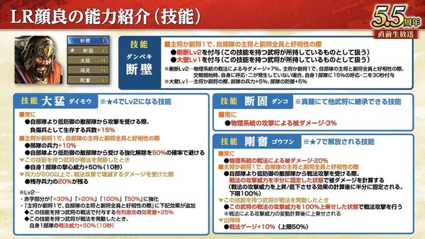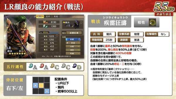 「LR顔良」は「豪昇」や「有利激攻」、撃心によって戦法攻撃で敵に大きなダメージを与えることができる騎兵武将。また敵部隊の戦法に対して高い耐久力を持っており、戦法が強力な武将からのダメージを抑えて戦うことができる。