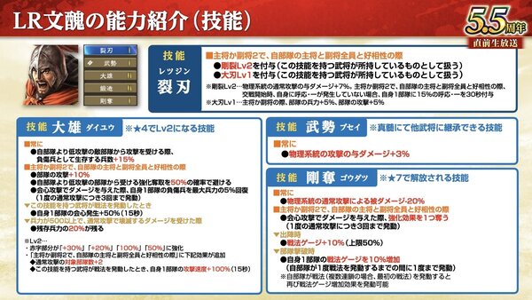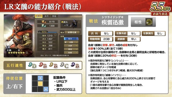 「LR文醜」は、「穿撃」や「威槍」によって通常攻撃で敵に大きなダメージを与えることができる騎兵武将。また敵部隊の通常攻撃に対して高い耐久力を持っており、加えて自身の会心発生時に「自部隊の負傷兵回復」を行うことで戦闘を有利に進めることが可能だ。
