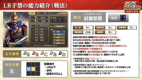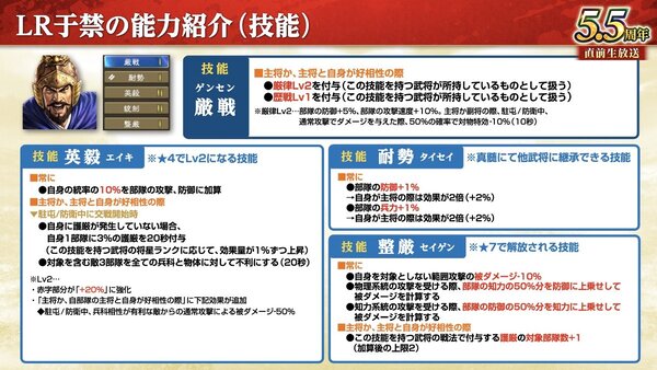 新有利変化「護厳」で駐屯/防衛中に素早い戦法発動を狙うことが可能で、兵科相性が有利な敵からの通常攻撃による被ダメージを大幅に軽減することができ、通常攻撃が強力な部隊に対して粘り強く戦うことができる「LR于禁」がシーズン武将として登場。