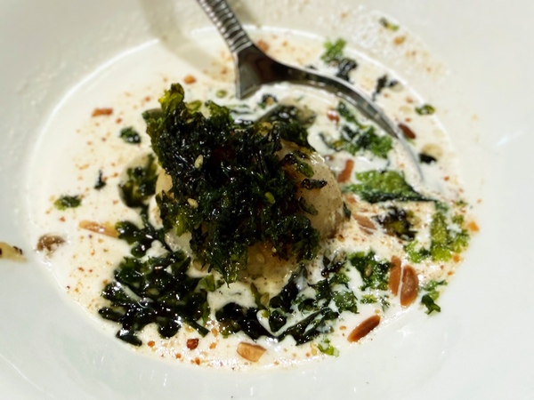 続く3軒目の「Casa Urola」では、ホタテ(スカロップ)を使った一品が登場。ここでエリックさんが教えてくれたのは、ガスパチョの歴史です。ガスパチョというとトマトの冷製スープという印象が強いですが、トマトがアメリカ大陸からヨーロッパへ伝わる以前は、アーモンドをベースに使って作られていたとのこと。アーモンドベースの白い元祖ガスパチョにホタテを合わせたこの料理は、ホタテから出た和風出汁のような強烈な旨味が特徴。海苔の食感もアクセントになり、こちらも日本人の舌にめちゃくちゃ合う逸品でした。(地図: Casa Urola)
