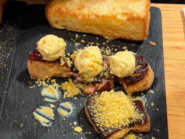 しかし、何よりも衝撃的だったのは「フォアグラのグリル ホワイトチョコレートとスイートコーンクリーム添え」です。香ばしいフォアグラの塩味と脂に、甘いホワイトチョコレートが合わさるという未知のマリアージュ。ツアーに参加した仲間を「人をダメにする食べ物」や「世界一悪魔的な美味さ」とうならせるほどの破壊力でした。