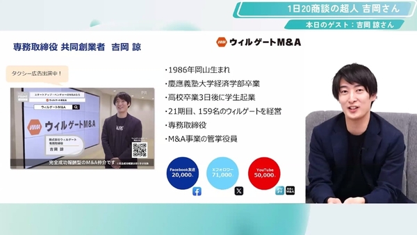 ウィルゲートは、IT・ベンチャーに特化したM&A仲介「ウィルゲートM&A」を中核事業として展開しています。吉岡氏が高校卒業3日後に学生起業した会社であり、2026年には21年目を迎え、従業員数は約160名に上ります。創業時からの強みであるSEO対策で築いた顧客基盤は、現在のM&A事業においても大きな原動力です。