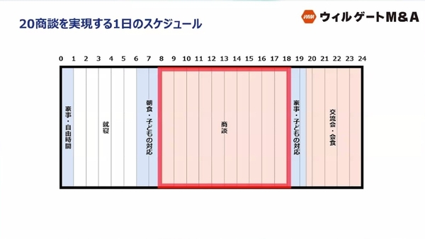 「1日20商談の実践方法は、朝8時から夕方18時までの10時間、“1アポイントあたり30分”と決めて埋め尽くすだけと、シンプルなものです。私は3児の父で、在宅ワーク。商談の隙間時間にも家事をこなし、6時から8時、18時から19時半のコアタイムには子どもの送迎もします。会食や交流会は、19時半以降に参加します」