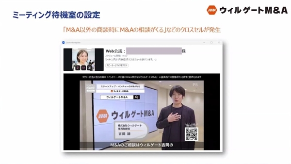 1つ目は「ミーティング待機室の設定」です。意外と知られていませんが、Zoomでは、参加者が会議の開始を待つ「待機室」画面に、いわば“無料の広告”として動画を流せる機能があります。ウィルゲートでは、M&A事業のCM動画を他部門の商談でも流して、社内の“トスアップ”につなげています。