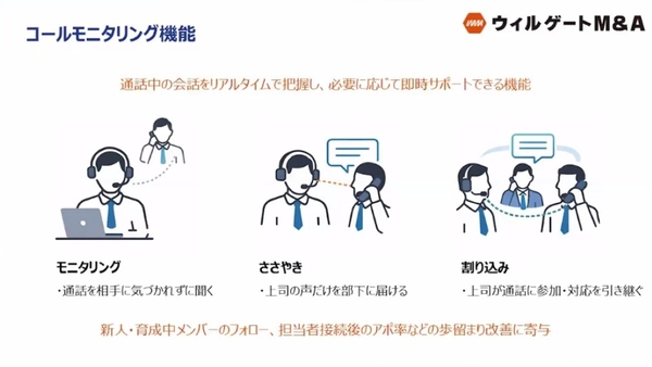 2つ目は、「コールモニタリング機能」です。通話中の会話をモニタリングして、必要に応じてサポートできる仕組みを、リーズナブルな価格で構築できます。プッシュ営業を中心とした、育成メンバーのフォローに役立てられています。