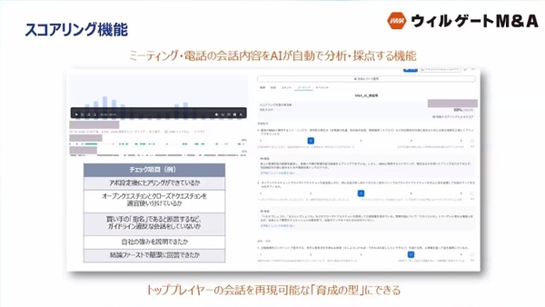 組織全体で商談の質を高められるのが「スコアリング」の機能です。トップ営業の商談データを分析することで、ほかの営業も体得しやすい「営業活動の型化」を実現します。この型に基づいてAIが商談の内容をチェックし、商談を行うたびにフィードバックが受け取れるので、自学自習で商談の質を高めていけます。