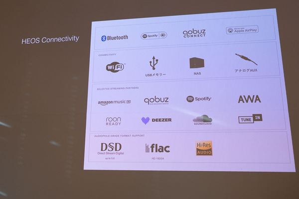 HEOSモジュールを搭載し、Wi-FiとBluetooth接続が可能。再生方法も多彩だ。AirPlay 2によるAppleデバイスとの接続、Spotify、Amazon Music、Qobuzなどの直接再生に加え、NASやUSBメモリー内のハイレゾ音源の再生まで幅広い音源に対応する。