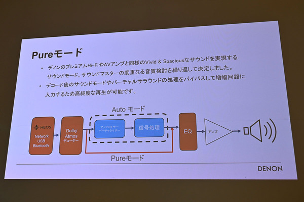 いずれの機種もDolby Atmosのデコードが可能で、再生時には「Autoモード」と「Pureモード」の2種類が選べる。Autoモードは独自のアップミックス処理によって、通常の2chステレオ音源であっても、広がりと豊かさのある立体音響の再生が可能なモード。PureモードはアップミキサーやDSP処理を極力スキップし、原音に忠実な再生を得るためのモード。デノンのサウンドバーでも高く評価されている、音の純度を極限まで高められる設定だ。