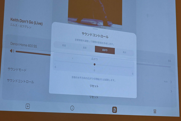 再生にはHEOSアプリを使用可能。基本的な再生/一時停止、選曲操作のほか、ストリーミングサービスをまたいだ音源の検索、入力ソースの切り替え、音量調整などが可能。さらに、空間オーディオにおけるサウンドステージの広がりを調整する機能も持ち、上向きのスピーカー(ハイトスピーカー)を搭載している「DENON HOME 400」と「DENON HOME 600」では「高さ」方向の音の広がりの調節も可能となっている。ただし、ステレオペアリングを組んだ場合は、横方向の広がりの調整はできなくなる。