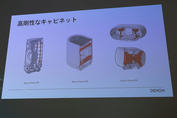 さらに、DENON HOME 200ではキャビネット内部には格子状の梁を設け、無駄な振動を徹底的に排除。他の機種も筐体の形状に合わせた堅牢な構造を採用して、音の濁りや曇りのないオーディオメーカーならではの妥協のない再生にこだわっている。