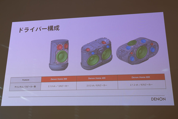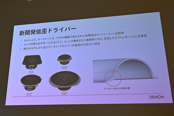 各製品とも、音質はデノンのサウンドマスターである山内慎一氏がチューニング。Hi-Fi機器やAVアンプなどを含め、価格帯を問わずデノンとしての「一本の筋が通った音」を実現している。新開発のドライバーには、たわみやすい紙ではなくアラミド繊維を採用。エッジ部分は厚みを不均一にすることで直線的なピストンモーションを可能にするといったノウハウを取り入れている。