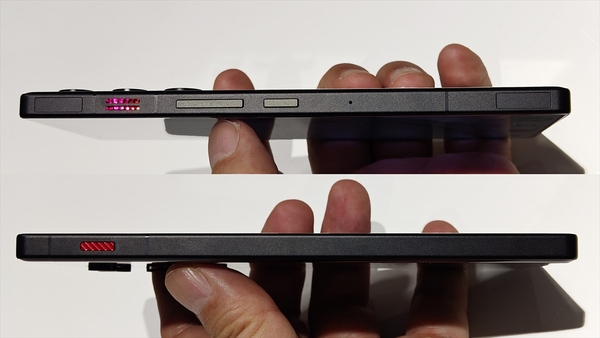 空冷ファンを搭載したことで本体の右側面には空気の入出口としてスリットがあいている。また、横持ちしたときにゲームボタンとなる520Hzのデュアルショルダートリガーを搭載。ボタンの形状は前モデルより角ばったものとなり、よりシャープな印象を与えてくれる。一方左側面にはゲームモードであるGame Space起動用のボタンが配置されている。