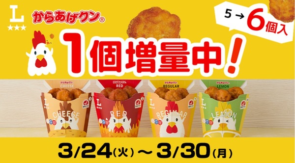 ローソンは、「からあげクン」を1個増量するキャンペーンを3月24日~30日の期間で実施します。