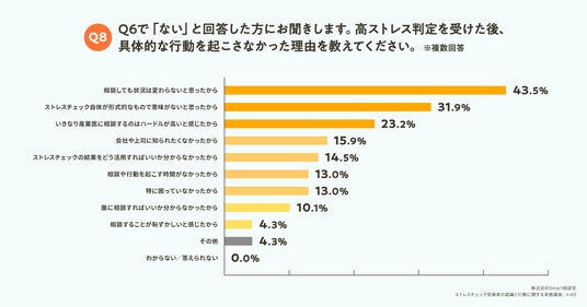 Q6で「ない」と回答した方に対して「Q8. 高ストレス判定を受けた後、具体的な行動を起こさなかった理由を教えてください。(複数回答)」(n=69)と質問したところ、「相談しても状況は変わらないと思ったから」が43.5%、「ストレスチェック自体が形式的なもので意味がないと思ったから」が31.9%、「いきなり産業医に相談するのはハードルが高いと感じたから」が23.2%という回答となりました。